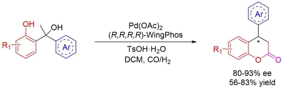 利用Pd-WingPhos催化剂,我们成功实现了二芳基甲醇的高效不对称氢甲酯化反应,并以高对映选择性和良好的收率得到一系列手性4-芳基-3,4-二氢香豆素化合物。