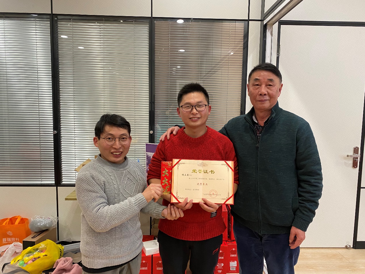年会上我们颁发了年度优秀员工和总裁奖,其中王红芳和刘玉荣被评为2019年度优秀员工,董伟被授予2019年年度总裁奖。