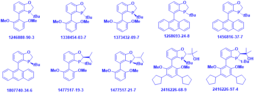 在众多P-手性配体中,近十几年来发展出了一类独特的、其基本母核含有P-手性二氢苯并氧磷杂环戊烷结构的P-手性配体,如图1所示。这类膦配体的反应活性和选择性已在众多化学转化中得到充分的验证。其具有以下特点:1)这类配体结构刚性,且大多数较为富电子,因此在交叉偶联和氢化反应中能促进氧化加成和还原消除环节,从而有利于推进反应进行;2)由于P-手性二氢苯并氧磷杂环戊烷的刚性很强,因此在不对称催化过程中构象明确;3)P-手性二氢苯并氧磷杂环戊烷的可修饰位点众多,能灵活的调整配体的电性和空间位阻,进而改变配体手性口袋的形状、深度及电性,最终针对不同的底物和反应达到理想的催化效果;4)此类配体大多对空气稳定,便于在工业生产中操作、使用;5)此类配体能实现公斤级以上生产,满足工业生产的需要。