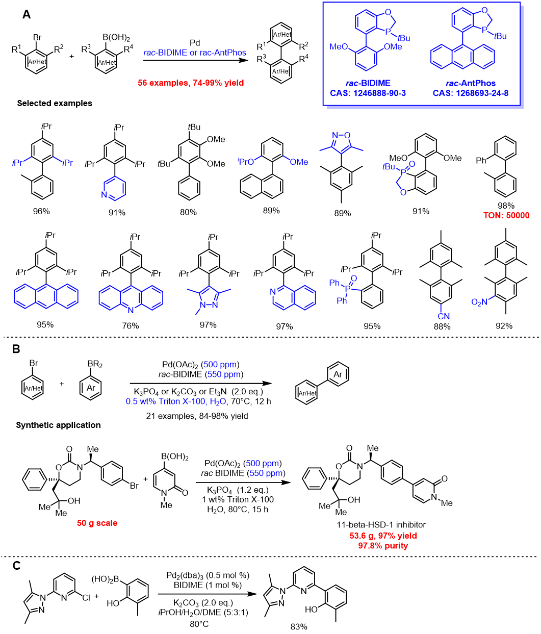 如图2所示,以rac-BIDIME或rac-AntPhos为配体,在Pd催化下能实现大位阻的芳基-芳基Suzuki偶联,获得一系列邻位三取代或四取代的联芳基类化合物。该方法具有产率高,官能团普适性强,催化效率高等优点:对于邻位具有异丙基、叔丁基等位阻极大的官能团能实现高效偶联;适用于萘环、蒽环等并环骨架底物;对于吡唑、恶唑、吡啶、异喹啉等杂环底物也有很好的催化效果;药物分子中常见的氰基、硝基、醛基、三氟甲基、磷酰基等官能团也能很好的兼容(图2A)。2017年,BI公司的研究团队发现,在非离子表面活性剂Triton X-100的存在下,使用BIDIME为配体,能在水中进行ppm级的Pd催化芳基-芳基Suzuki偶联,并在50g级规模上以几乎定量的收率合成了一个11-β-HSD-1抑制剂(图2B)。rac-BIDIME在连续流反应中也有应用,能满足大位阻、多杂环底物的Suzuki偶联,并在克级规模上得到验证(图2C)。基于上述优点,BIDIME和AntPhos在含有多取代联芳基药物中具有很大的应用潜力。