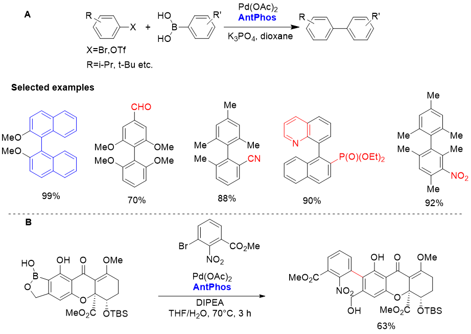 AntPhos已广泛应用于Suzuki-Miyaura偶联反应,尤其是在大位阻底物