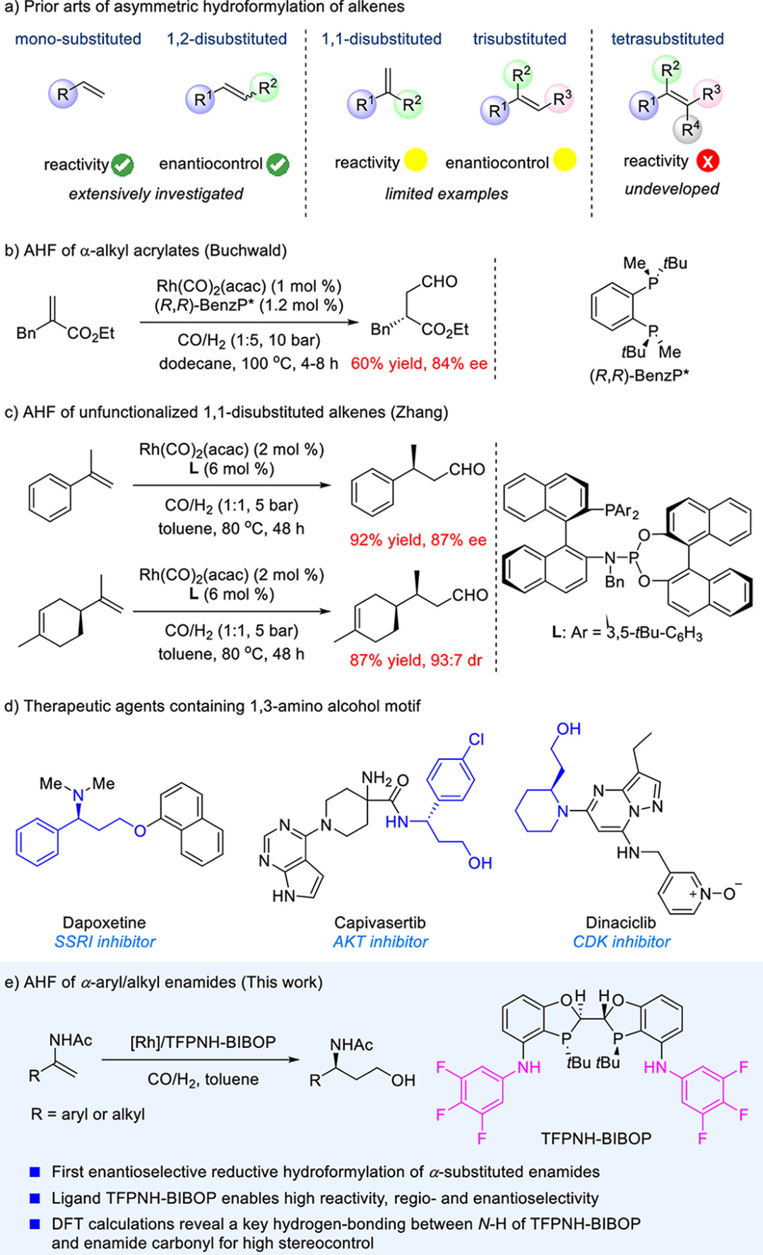 手性γ-氨基醇结构广泛存在于药物分子中,例如治疗早泄的选择性5-羟色胺再摄取抑制剂dapoxetine、用于乳腺癌治疗的丝氨酸/苏氨酸激酶抑制剂Capivasertib及用于多种癌症的细胞周期蛋白依赖性激酶抑制剂Dinaciclib。发展多取代、官能团化烯烃的不对称氢甲酰化构建手性γ-氨基醇结构具有重要的研究意义。